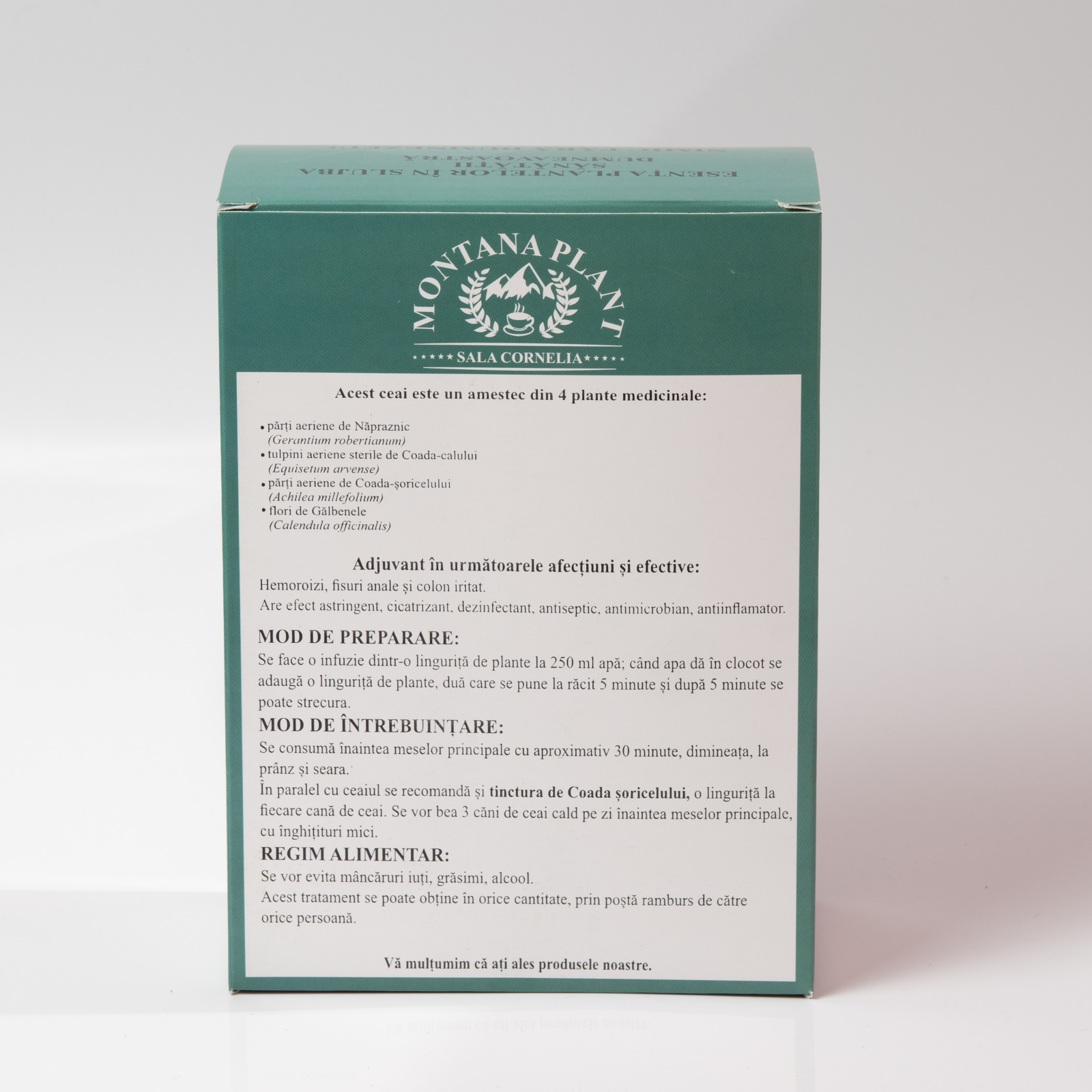 Ceaiul este preparat din plante culese manual din Munții Apuseni și ambalate atent pentru păstrarea proprietăților terapeutice.